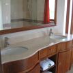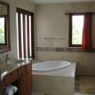 The large in-suite bathroom features a jacuzzi bath tub, a separate large two head shower area, a separate water closet area with bidet, and double sinks.
