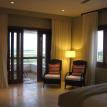 The master suite features a large king-sized bed, a large 42” flat screen TV, a sitting/reading area, and access to a porch, also accessible from the living space, featuring a large plunge pool and sitting area.