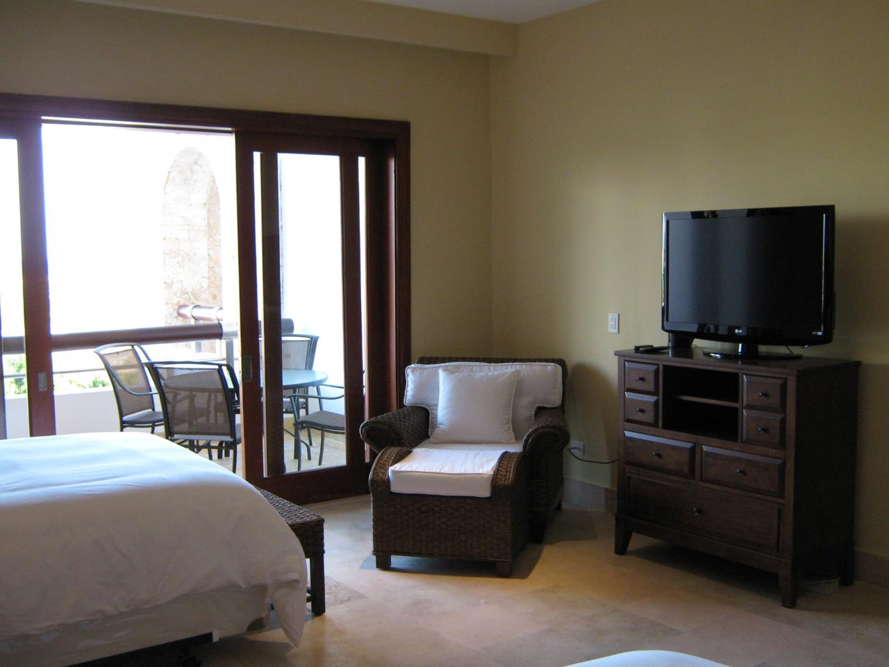 The master suite features a large king-sized bed, a large 42” flat screen TV, a sitting/reading area, and access to a porch, also accessible from the living space, featuring a large plunge pool and sitting area.