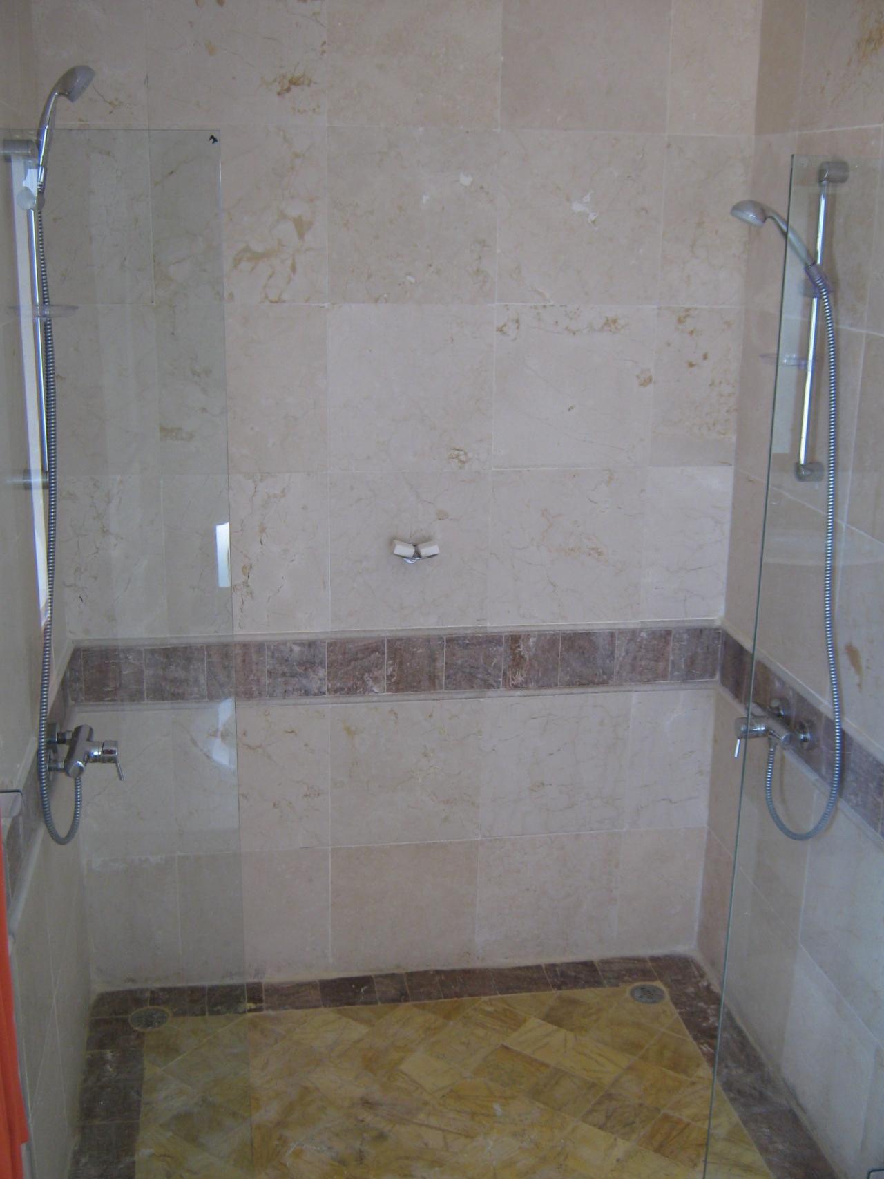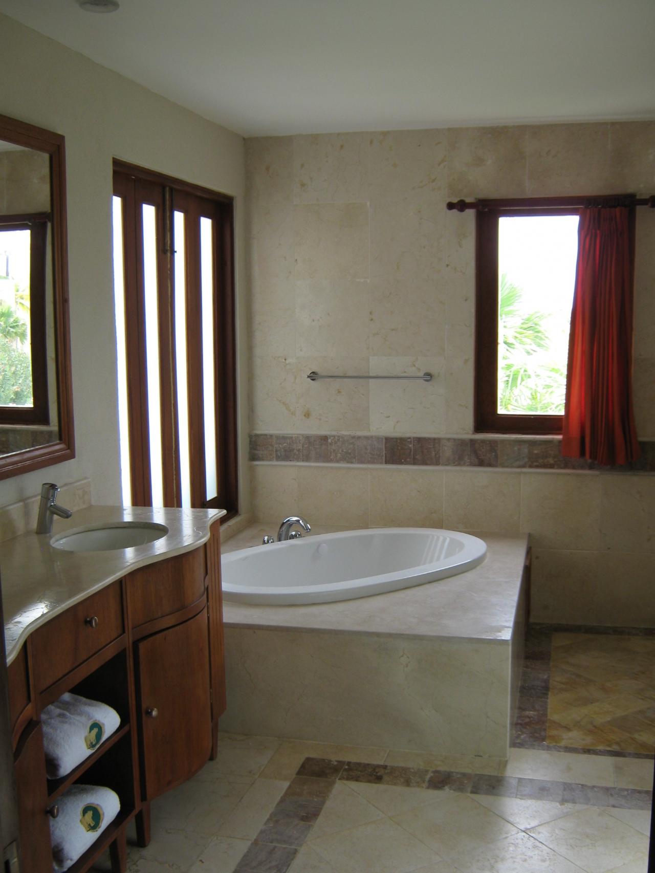 The large in-suite bathroom features a jacuzzi bath tub, a separate large two head shower area, a separate water closet area with bidet, and double sinks.